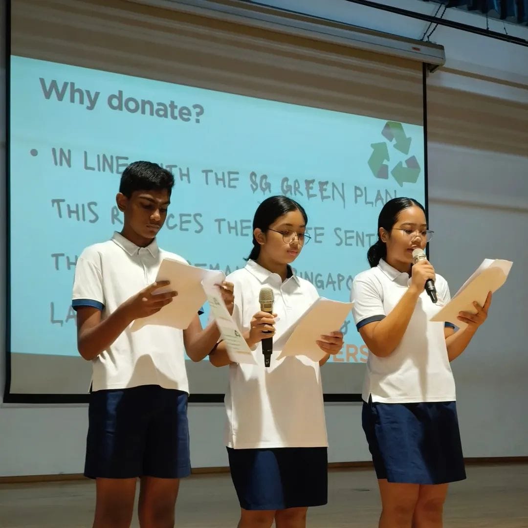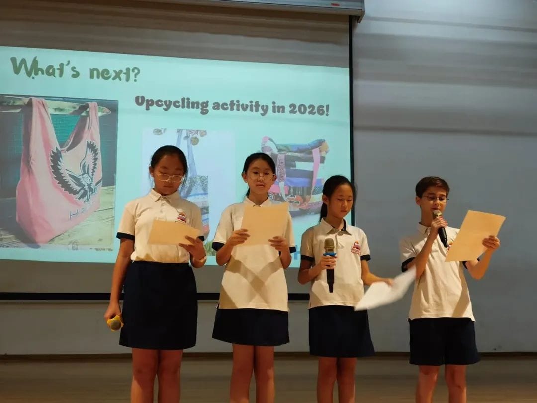 Leading with purpose: Student leaders present the T-shirt donation initiative for the P3 upcycling activity.